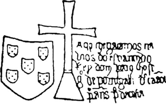 康奋斗过程的最震撼人心的纪念物,位于刚果河上游的叶拉拉瀑布。乘帆船或划桨船抵达此处的人,必然要从海口逆流而上100英里,途经红树林沼泽和植被茂密的河岸。随着他们的前进,水流也越来越强劲,直到他们抵达一处怪石嶙峋的峡谷,看见声若雷霆的瀑布,巨大的激流就这样从非洲的心脏喷涌而出。他们的船只再也不能前进,于是他们丢下船,攀爬岩石,前进了10英里,希望找到可供通航的上游水道,但接连不断的湍流粉碎了他们的希望。在那高高耸立于震耳欲聋的激流之上的岩壁的表面,他们留下了一幅雕刻,这是另一种类型的纪念碑。他们刻下了若昂二世国王的纹章、十字架和几句话:“伟大的君主,葡萄牙国王若昂二世国王的船只抵达此地,水手有迪奥戈·康、佩德罗·阿内斯、佩德罗·达·科斯塔、阿尔瓦罗·皮里斯、佩罗·埃斯科拉·A……”右下角是另一个人刻下的其他姓名:“若昂·德·圣地亚哥、迪奥戈·皮涅罗、贡萨洛·阿尔瓦雷斯,病号有若昂·阿尔瓦雷斯……”[18]另一个地方则只刻下了一个教名:“安塔姆”(“安东尼”之意)。