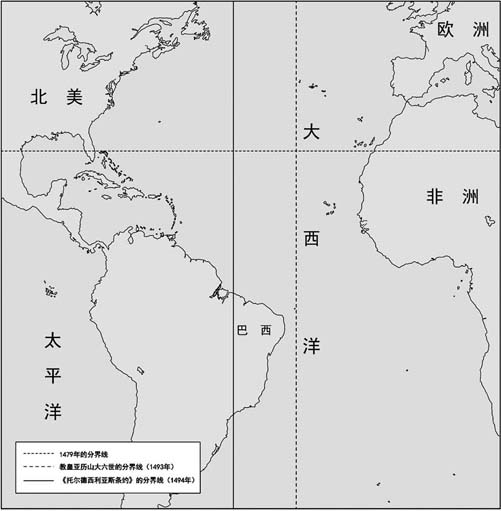 瓜分世界:葡萄牙与西班牙争夺大西洋之外新发现土地的竞争将导致一系列持续的争端。若昂二世国王说得对,哥伦布的确侵犯了1479年边界以南的葡萄牙势力范围。教皇的解决方案对西班牙非常有利。在1493年的一连串教皇诏书中,他规定,以南北两极之间、亚速群岛和佛得角群岛以西100里格处的子午线为界。于是,西班牙人有权占据这条子午线以西的所有土地,远至印度,而葡萄牙从这条线向东航行似乎得不到多少东西。若昂二世不能接受印度被排除在葡萄牙势力范围之外。在托尔德西利亚斯,这条线被向西推移了170里格,囊括了此时尚未被发现的巴西海岸。葡萄牙还重新获得了这条线以东的未发现土地的权益。1521年,当西班牙人向西航行抵达摩鹿加群岛[28]时,《托尔德西利亚斯条约》在世界的远端引发了更多争议,因为葡萄牙人早在1512年就通过向东航行抵达了这里。
