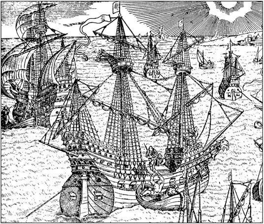 葡萄牙人的克拉克帆船,配有大量火炮和大型战斗平台