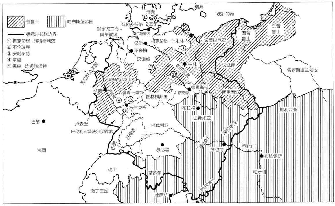 1815年的德国和1648年的德国大相径庭。但从外表来看,并没有那么多的不同:其土地大多是农业用地,有村庄,有起伏的牧场和茂密的森林,有中世纪的城镇和城堡,还有雄伟的宫殿、教堂和修道院。所有这些在下一个世纪都要改变。法国大革命震动了德国政治,但下一个世纪,工业革命将给德国带来更大的变化。由于德国奇特的政治格局,政治危机和社会经济变革的相互作用对德国今后的发展影响深远,并一直持续到21世纪。