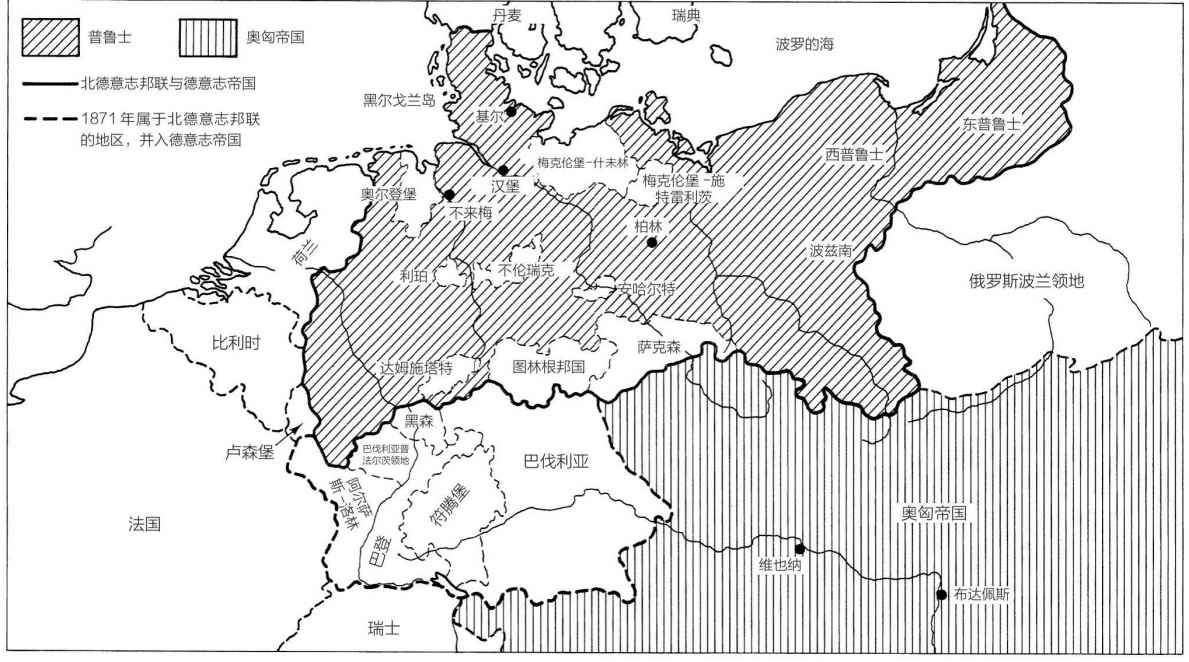 普法战争中,德国南部邦国在民族主义热忱的煽动下,加入了北德意志邦联。此时战争结束,这些邦国意识到无论在军事上还是政治上,他们都没有选择权,只能留下来。1871年1月18日,德意志帝国成立,并在凡尔赛宫举行庆典,德意志邦国的国王们将德意志帝国的世袭帝位授予了普鲁士国王威廉一世。不管之后民族主义者如何吹嘘,当时各方都不是很乐意,包括诸侯们和新皇帝自己,因为俾斯麦并不是怀着爱国主义的热情想要统一德国,他所谋求的只是普鲁士势力的成功扩张。