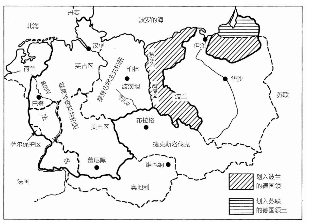 最初,同盟国在计划德国的未来时产生了分歧,无法达成一致。战争期间,同盟国曾在德黑兰(1943年)和雅尔塔(1945年2月)讨论过这一事项,当时与会国一致同意德国应该被划分成几个占领区,而在雅尔塔会议上,与会国又认为除了英国、美国和苏联外,法国也应当拥有自己的占领区。在赔款和战后波兰的西部边界问题上,苏联和西方国家已经有了明显的分歧。1945年7—8月召开的波茨坦会议掩盖了这些分歧,美国、英国和苏联在会上通过了对德政策的总策略,即德国必须去纳粹化、去军事化,同时民主化。但三国并未通过具体的、可行的提议,因此,不同占领区仍然无法实施一致的计划。5月8日,德国无条件投降,因其为没有政府的被占领国,此时无法达成任何和约。在等待和约签订期间,为方便管理,波兰的西部边界暂时划定为奥得河(Oder)和尼萨河(Neisse rivers)西段。德国疆土因此西移,东部边疆则划归波兰和苏联。波兰的国土也因此西移,并失去了东部的领地。由四国控制的柏林同盟国管制委员会负责协调不同占领区的政策。赔款则由每个占领区的国家分别制定,而苏联由于损失巨大,可以获得西部占领区的额外赔偿,其中一部分实际上是为了从大部分从事农业的苏联占领区人民手中换得一些粮食。会议最终以《波茨坦会议议定书》作结。法国虽然获得了一个占领区,但没有出席波茨坦会议,后来并没有被这些决定牢牢束缚。然而,由于会议达成的决定大部分相当模糊而笼统,占领国可以对其做出很多种不同的解释。