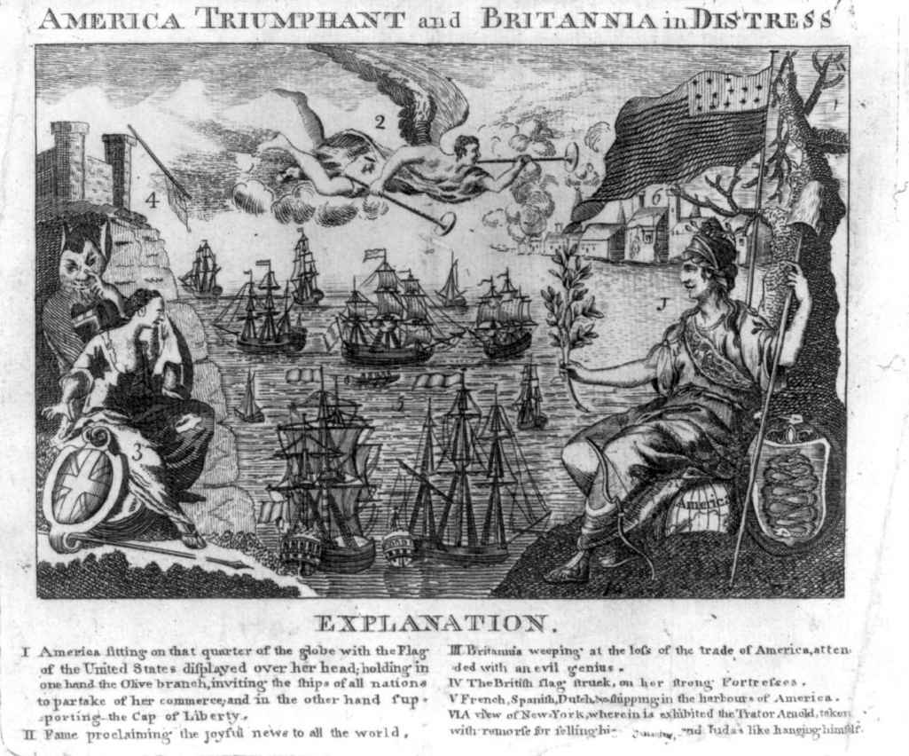 图22 《美国的胜利与大不列颠的悲伤》。韦瑟怀斯《城镇乡村年鉴》(波士顿,1782年)卷首插画。由美国国会图书馆印刷品与照片部友情提供(LC-USZC4-5275)。