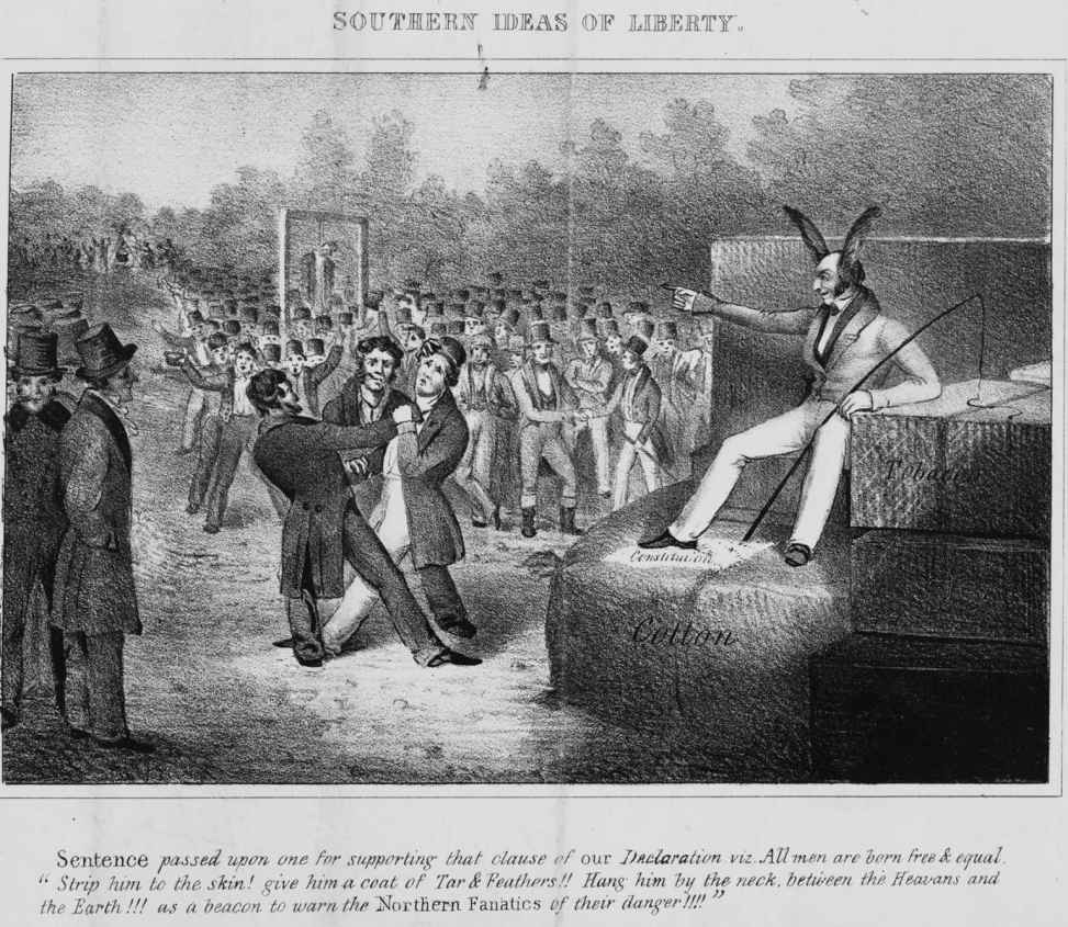 图26 《南方的自由理念》(波士顿,1835年)。这幅废奴主义作品表现了19世纪30年代中期南方对于反对奴隶制的人的处置方式。这一时期在佐治亚、路易斯安那和密西西比州都曾对反奴隶制活动分子处以绞刑或给其浑身涂上柏油粘上羽毛。1835年,在国会就“闭嘴法案”展开辩论之前,南方各州就通过了决议,号召镇压废奴主义者组织。在这幅图中,一个戴着驴耳朵、手执鞭子的法官坐在大捆的棉花和烟草上,脚踩美国宪法,判决绞死一名废奴主义者。图像下方的文字写道:“判决宣布,他支持《独立宣言》里的那句话,即人生来自由平等。把他的衣服扒光!给他浑身涂上柏油粘上羽毛!!把他吊起来,让他生不如死!!!杀一儆百,让那些北方狂热分子知道自己的危险!!!!”由美国国会图书馆印刷品与照片部友情提供(LC-USZ62-92284)。