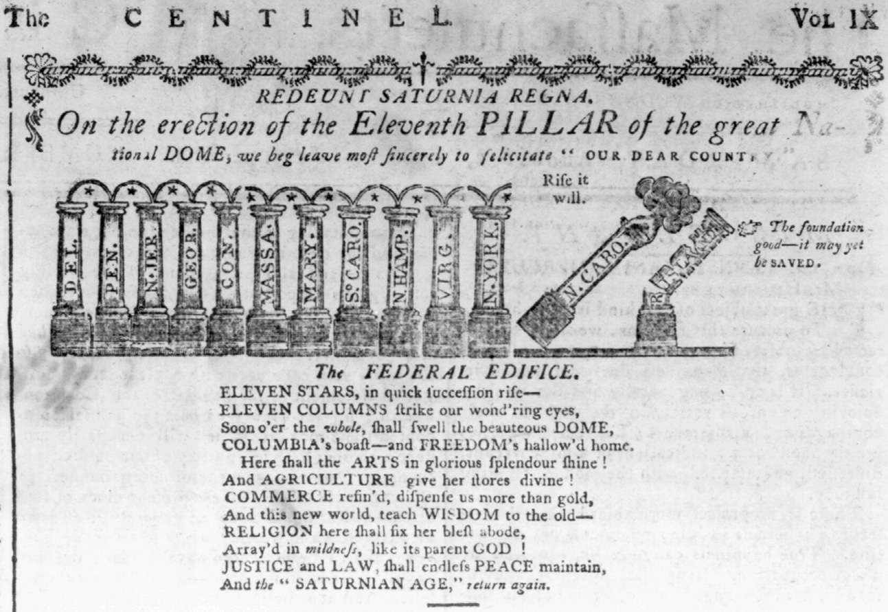 图23 《联邦的支柱》,1788年8月2日。这是发表在《马萨诸塞哨兵报》上的系列版画(1月16日、6月11日、8月2日)中的第三幅,也是最后一幅。第一幅版画名为“合即立,分即垮”,在这幅画里,一只天堂之手正在引导代表马萨诸塞的圆柱立在分别代表特拉华、宾夕法尼亚、新泽西、佐治亚和康涅狄格的圆柱旁。第二幅版画名为“回到沙屯的统治”(原文为拉丁语,意为“回到光荣的统治”,出自维吉尔《牧歌》第四首,美国大印章上也有此箴言),在这幅画里,增加了代表马里兰和南卡罗来纳的圆柱,并且代表弗吉尼亚的圆柱也正在安置。在最后这幅同样名为“回到沙屯的统治”的版画中,已有11根圆柱(增添了新罕布什尔和纽约的圆柱)到位,画中着重传达了美国是“自由神圣的家园”以及批准宪法能够带来“沙屯时代”(即黄金时代)的信息。“神圣之手”正在立起第12根代表北卡罗来纳的圆柱。根据版画显示,这时只剩下代表罗得岛的圆柱还有破碎的危险,但画中注释写着“基础稳固——也许还有救”。由美国国会图书馆印刷品与照片部友情提供(LC-USZ62-45591)。