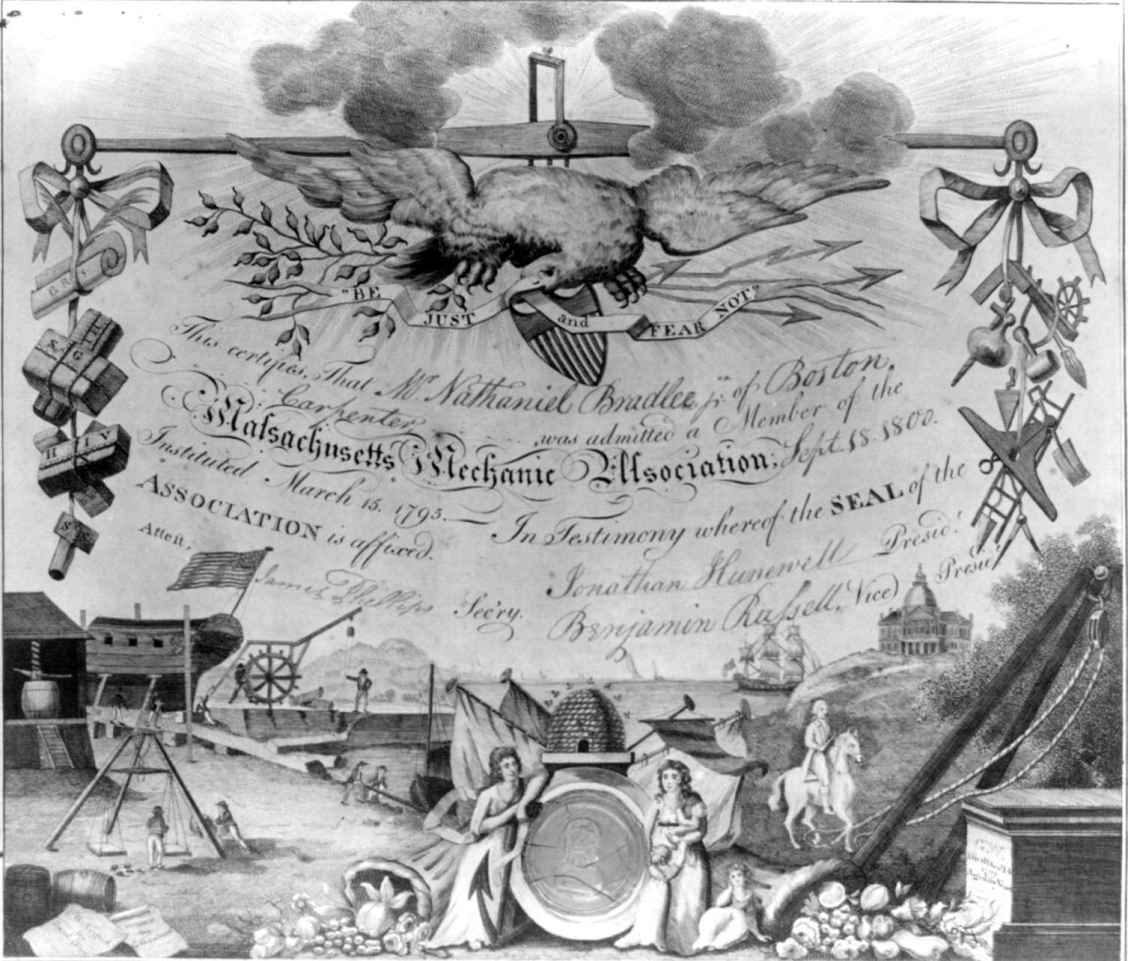 图24 《马萨诸塞技工协会》(日期不详,雕工塞缪尔·希尔,1766?—1804年)。马萨诸塞技工协会是美国早期职业兄弟社团之一,也是工会的前身。技工协会的建立不仅表明新国家有了更多的工作机会,也进一步认可了工人在共和国的成功中发挥的作用。这种协会不屈从于精英阶层,认为工作是一种美德,强调民主社会中的工人享有经济、社会和政治独立。图中为木匠纳撒内尔·布拉德利1800年的入会证明。图中不仅在顶部融入了国家形象(鹰),也在底部中间位置绘制了勤劳的蜂巢,让人想到大印章和印章上的箴言。这幅图传达的信息是技工发挥各自的技术特长,美国将会成为一个富饶之国(两位女性两侧装满花果及谷穗的羊角状物即在强调这点)。图中的共济会图像也是当时比较普遍的,当时许多的美国城市里都有共济会社,大多数的共济会纲领符号都可以在国家性的图像中看到。由美国国会图书馆印刷品与照片部友情提供(LC-USZ62-33263)。
