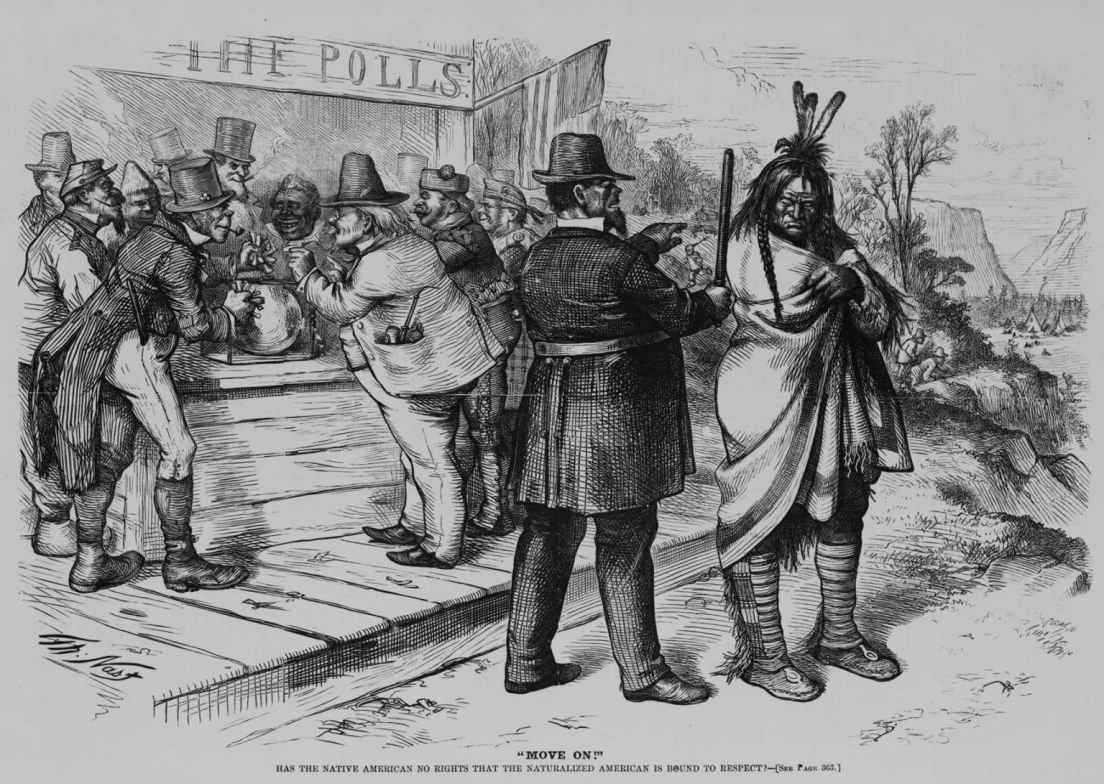 然而,让土著融入美国是很成问题的,在19世纪晚期当然也没能实现。1816年时,国会通过了《印第安开化法案》,鼓励以同化的手段促进白人定居者扩张进入土著地区。假如印第安人摒弃了自己的部落联盟,就可以被归化成为美国公民,但也只是在一定程度上。他们并不会自动获得投票权(见图41),许多土著人住的只是过渡性的房子,拥有的是双重国籍,而这种身份在损害他们在部落的位置的同时,却没有给予他们与美国公民或归化移民同等的身份。海伦·亨特·杰克逊(Helen Hunt Jackson)在《世纪的耻辱》(A Century of Dishonor,1881年)一书中向美国政府虐待土著部落的做法提出了最为严厉的控诉。明尼苏达州主教亨利·本杰明·惠普尔(Whipple)在为这本书作的序言里写道:“印第安人是我们国土上唯一没有任何个体权利的人种……他的权利融在部落之中——他在法律面前毫无立足之地。”[26]