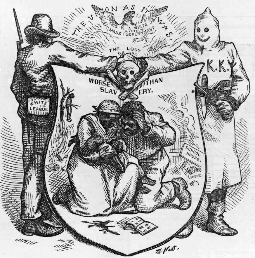 图36 《联邦胜利之后/奴隶的生活反而更遭》。这幅由托马斯·纳斯特绘制的漫画出现在1874年10月24日的《哈泼斯周刊》上。这一年正是《民权法案》通过的前一年。这幅漫画强有力地表明:尽管1870年和1871年通过了《执行法案》,特别是1871年通过的《三K党法案》(《第三执行法案》),并且1870年6月也建立了司法部,各种各样的白人至上主义团体,例如“白人联盟”(图中左侧人物身上的徽章)以及出现在密西西比、后来势力扩大到南卡罗来纳的“红衫军”都在继续压制南方非裔美国人的民权。由美国国会图书馆印刷品与照片部友情提供(LC-USZ62-128619)。