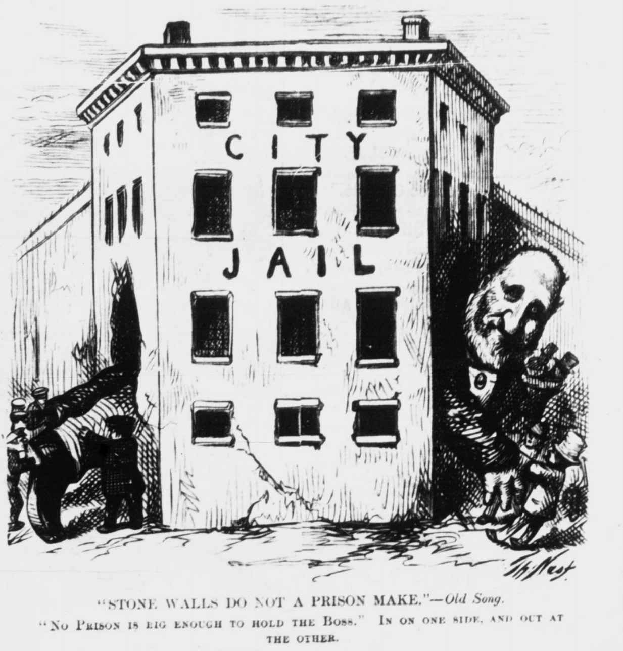 在现代人眼中,特威德这种公然挪用公款牟取私人利益的做法可能并没有多么不寻常。1873年的全球金融恐慌加剧了金融腐败,格兰特的政权日渐倾颓,因而在当时的人看来,特威德的举动也不算特别出格。“特威德集团”虽然也带来了一定的涓滴式经济效益,但他们远不是亚瑟王的那些高贵伟大的圆桌骑士,而是海勒姆·惠特利称之为“欺诈和恶行”的那个时代的典型人物。惠特利认为这种欺诈的推动力正是移民。他抱怨“几乎所有国家的移民都在不断踏上我们的土地”,其中许多人“今天是欧洲的重罪犯,明天就成了美利坚合众国的公民”。“无政府主义者、伪造者、造假者和小偷每年都在增加”,其中不少人都是“野心勃勃的穷人,实现了他们靠先前的卑微手段所不能实现的生活”。