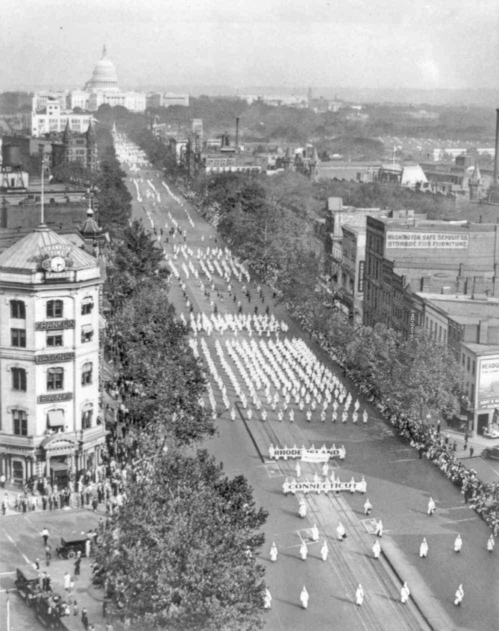 图52 三K党游行,华盛顿地区(宾夕法尼亚大道),1926年9月13日。大多数与三K党相关的象征都来源于20世纪早期三K党卷土重来的时期。如照片中所示,三K党公然地展示自己,将自己置于美国的中心位置。然而,在三K党这样展示自己“实力”的时候,它已经不再像20年代初那样具有强大的政治实力,但也没有完全失势。由美国国会图书馆印刷品与照片部友情提供(LC-USZ62-59666)。