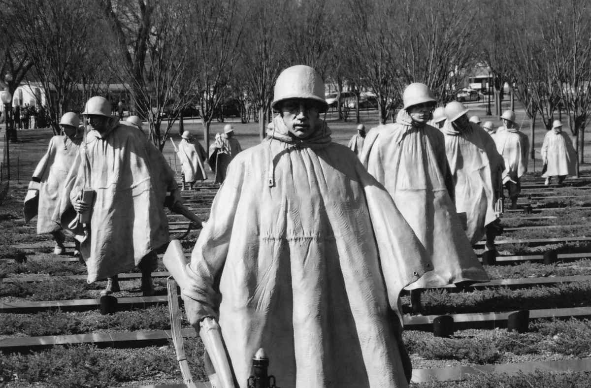 图61 《华盛顿朝鲜战争纪念园》(彼得·威尔逊摄)。很多年以来,朝鲜战争几乎已经被人遗忘。不过,这座纪念园却有意强调这场战争中的美国军队是由多个种族构成的。纪念园内有19座雕塑,所有都比真人要大,高2.2米,组成侦查时的箭头方阵。其中包括12名白人、3名非裔美国人、2名西班牙裔美国人、1名东方人和1名美国土著。这些雕塑同时也体现了当时美国军队中的不同军种,其中包括14名陆军、3名海军陆战队士兵、1名海军军官和1名空军士兵。建造这种纪念园在20世纪50年代是很难想象的。这个纪念园的建造历经几十年的讨论,最后于1995年落成完工。