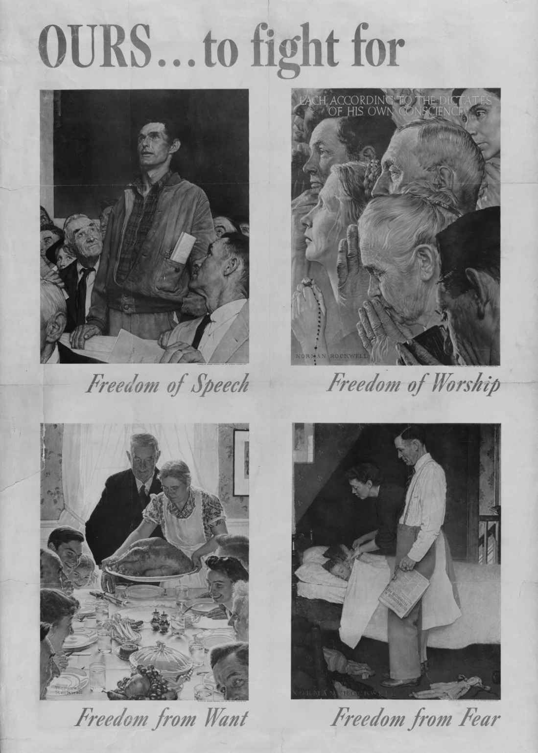 罗斯福宣称:“在华盛顿的时代中,人民的任务是创立和团结成为一个国家。在林肯的时代中,人民的任务是保护这个国家免遭内部分裂。如今,人民的任务是挽救这个国家及其建制,使它免受外部瓦解。”罗斯福敦促美国人思考他们“在历史上占据了什么地位”,提醒他们美国的“精神”和它的“生命力已经被写在了我们自己的《五月花号公约》、《独立宣言》、《宪法》和葛底斯堡演说中”。[4]罗斯福传达的讯息在一些巡回展览和爱国刊物中得到加强,这些都让美国人意识到,在一个已被专制独裁所摧毁的世界中,美国作为民主国家的范例,占据了至关重要的位置。1941年11月,一副象征着四大自由和“民主的兵工厂”的巨幅海报在华盛顿特区的广场上揭幕,之后又进行了全国巡展。