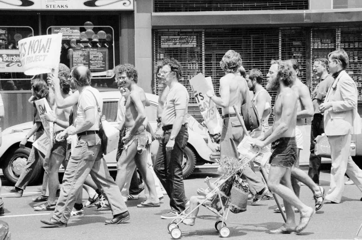 图68 1976年,民主党全国代表大会在纽约举办期间,发生了一起同性恋权益游行(沃伦·莱弗勒于1976年7月11日拍摄)。美国最高法院在2003年裁决指出,将同性恋行为定为犯罪是不符合宪法的。由美国国会图书馆印刷品与照片部友情提供(LC-DIG-ppmsca-09729)。