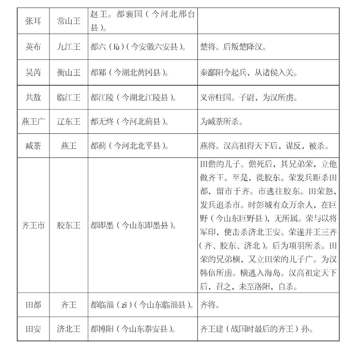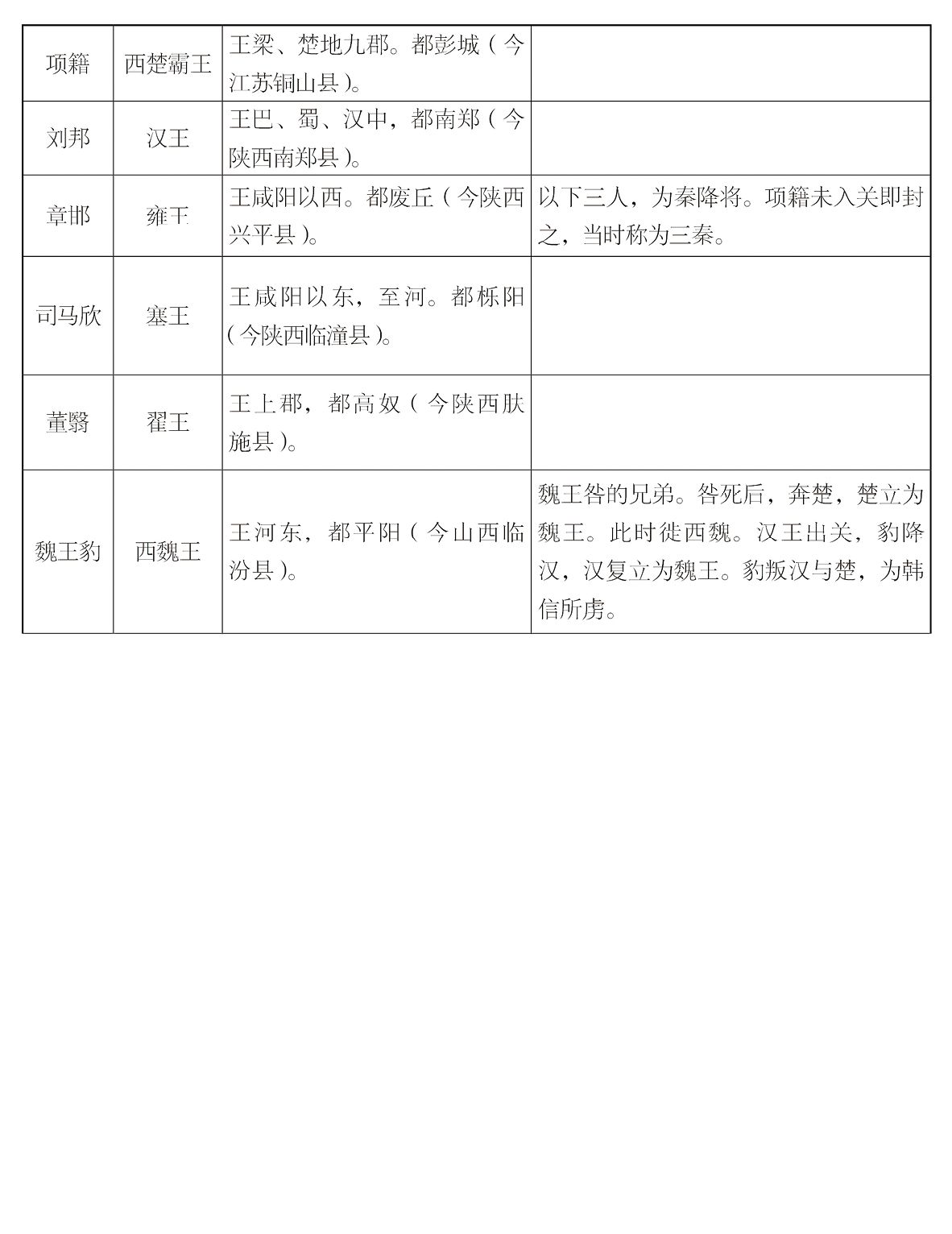 这时候,封建思想,还未破除。亡秦之后,自然没有推一个人做皇帝之理。于是便要分封。当封的,自然是(一)前此六国之后;(二)亡秦有功之人。而分封之权,自然是出于众诸侯的会议,能操纵这会议的,自然是当时实力最强的人。于是项籍便和诸侯王,议定分封的人,如下: