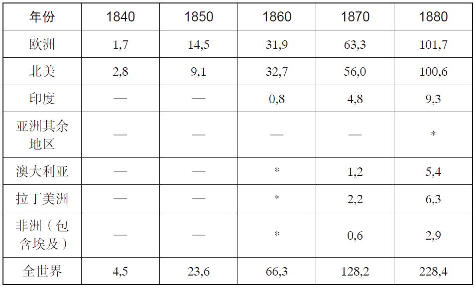 缩短长距离旅行所用时间的努力,收效相对不大,这完全是因为海上航行速度的改善十分缓慢。1851年,从利物浦横渡大西洋到纽约的汽船平均航行时间是11—12.5天;到1873年基本上仍然如此,尽管“白星航班”自豪地宣称,它们已把时间缩短到10天。[5] 除非海上航路本身被缩短,例如苏伊士运河的开通,否则福格休想比1848年的旅行者做得更好。真正的变革发生在陆地上,亦即在铁路方面,而且即使是这方面,真正的发展也不是火车速度的提高,而是铁路建设的高速发展。1848年的铁路运行速度,整体而言比19世纪70年代慢得多,尽管它从伦敦到霍利黑德(Holyhead)只用了8.5小时,比1974年慢3.5小时。然而,19世纪30年代发明的火车确实是一种非常强大的机器。但直到1848年,除英国以外,全球尚不存在铁路网。