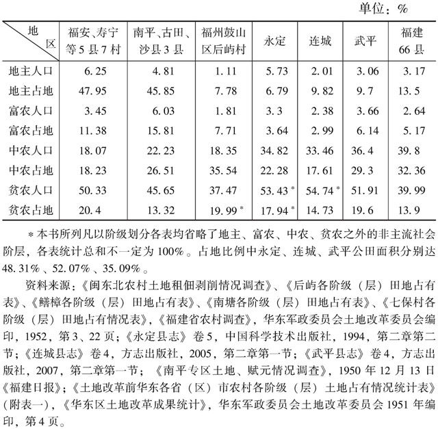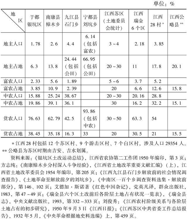 之所以这样说,一方面是上述数据可以得到当时中共内部有关报告的证实,如关于湘赣边苏区的报告中就明确提出“边界的经济本来是一个小农经济区域,自耕农甚多”,[62]江西万安也是“自耕农占全县人口大半”;[63]另方面,我们还可以把上述调查数据和1950年前后江西、福建土地改革专门机构在农村所作的一系列调查加以对比,相互得到印证。虽然由于时代的不同,两者间不一定具有完全的可比性,如可以发现,在不少地区,1940年代末的土地集中程度略高于抗战前。浙江丽水城区第一、第四行政街地主抗战前占地661.4亩,抗战后达到837.2亩,占有率提高了13个百分点。[64]江西丰城小袁渡乡战前地主占有土地(包括公田)达28.72%,解放前夕为30.5%。[65]不过,相反的例子也并不罕见,湖北二十个典型乡(土地一般集中区)战前地主富农占地32.29%,解放前夕为28.95%。[66]浙江丽水南明乡4个村1939年地主、富农占地高达64.48%,1948年为58.82%。[67]总起来看,无论是集中或分散,抗战前和解放前夕两时期偏差不是十分剧烈。而地处苏维埃革命中心区的福建,1931年和1935年两年自耕农的比例都是27%,[68]反映出革命前后的地权变化也并不剧烈。由于存在着此消彼长的状况,如果从大的范围衡量,总体上增减变化应不会很大,1940年代末的数据尚能代表1920~1940年代土地占有状况。下面二表所列就是以1950年前后闽、赣两省土地改革专门机构调查结果形成的综合数据。