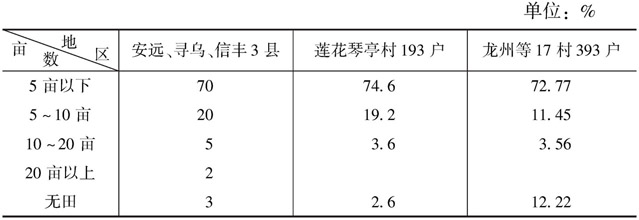 从表1看,各地拥有土地的农户达到总数的90%左右,完全无地的农户数量不多,最多的也只是稍高于10%,但每户拥有土地在5亩以下的缺地少地农户比例很高,普遍在70%以上,证明农民缺地少地的现象还是很严重的。虽然,这些调查在对象选择和数据统计上可能不无偏颇,如只是对不同土地占有量的户数作了统计,却没有对其土地占有数作出说明,有意无意地将土地占有不平衡的现象加以模糊。但有理由相信,它仍然反映了苏区土地占有的部分实况。