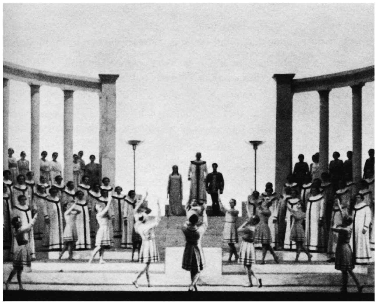 4.莫扎特《魔笛》,柏林市民歌剧院1938年9月制作。制作人卡尔·莫勒和 舞台设计瓦尔特·库伯努斯呈现了一个国家社会主义的重新诠释,在这个场景中特别表现为人群恭迎萨拉斯特罗时举起的右 臂。