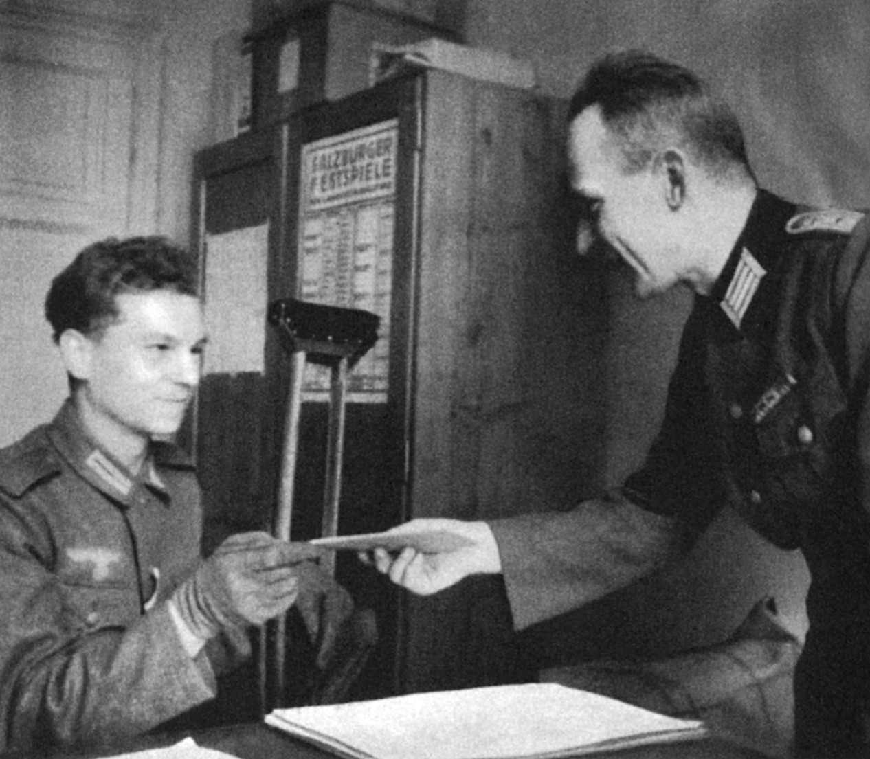 17.1941年萨尔茨堡音乐节,一位受伤士兵从另一位士兵手中接过演出 票。
