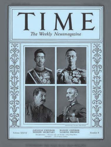 自左上顺时针方向依次为:日本裕仁天皇、溥仪、蒋介石、斯大林。这四个人,被《时代》周刊评为当时“最能影响亚洲格局”的四个人