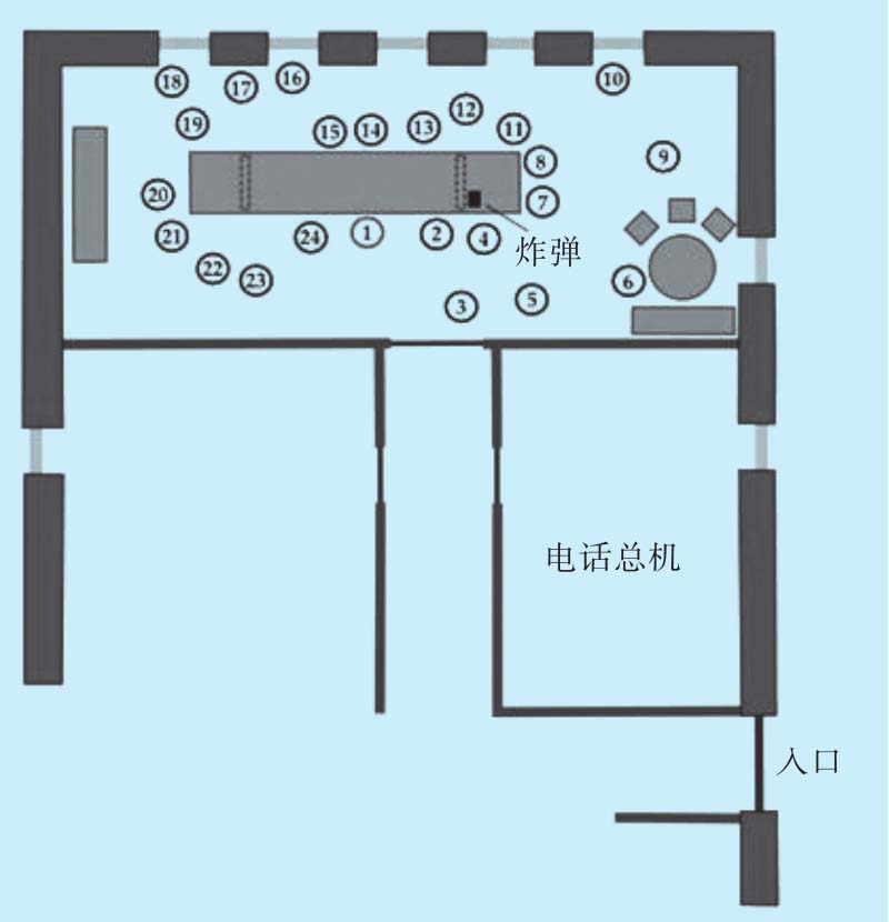 当时会议室的平面图。①的位置是希特勒的位置,黑色小方块为炸弹位置,当中隔了一层木板