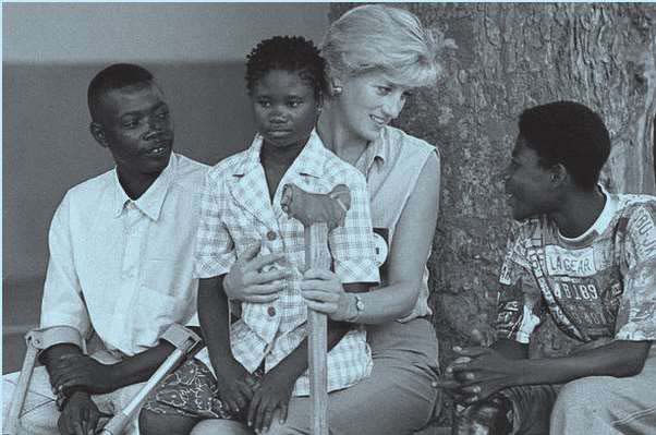 戴安娜在安哥拉抱着一名因为误踩地雷而受伤截肢的孩子。到21世纪初,全世界有超过135个国家签署禁雷条约。戴安娜作为当初带头呼吁的名人,起到很大的推动作用