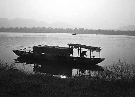 【图:我和应扬坐在湘江的一叶小船上,老船夫把篙放下来,让船在湘江的水上自由漫荡。】