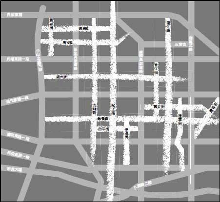 你把街道图打开,靠过来,跟我一起看:以南北向的中山路、东西向的忠孝路画出一个大的十字坐标,分出上下左右四大块,那么左上那一区的街道,都以中国地理上的西北城市为名,左下一块,就是中国的西南;右上那一区,是东北,右下,是东南。所以如果你熟悉中国地理,找“成都路”、“贵阳路”、“柳州街”吗?