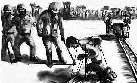 有时候,俘虏在烈日曝晒下立正。有时候,被命令双手高举一块重石,日本兵把上了刺刀的枪顶在他双腋下。丹尼士看过一个少年俘虏被吊在一棵树上,离地几呎,日本兵把上了刺刀的枪架在少年人的双腿之间……