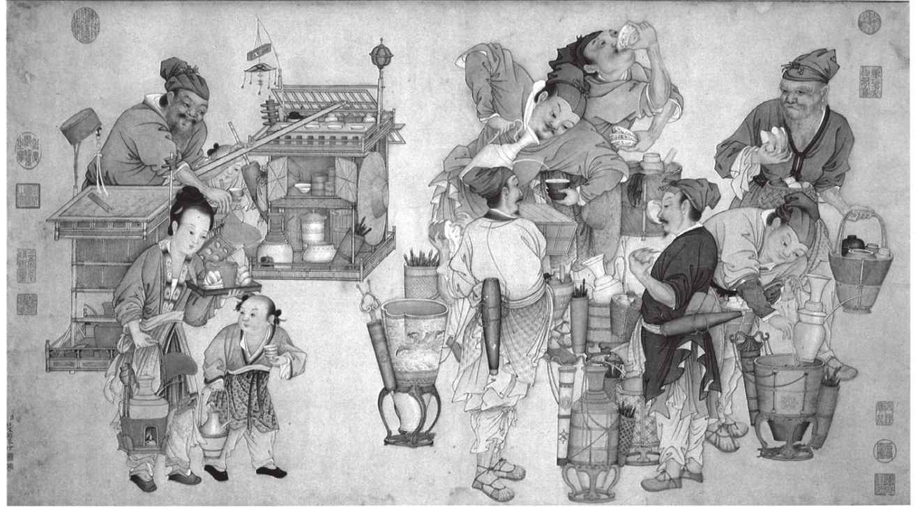 宋人将点茶的技艺,发挥到极致,又形成了一种叫作“分茶”的高超茶艺。出色的分茶高手,能够通过茶末与沸水的反应,在茶碗中冲出各种栩栩如生的图案,成书于北宋的《清异录》记述说,“近世有下汤运匕,别施妙诀,使茶纹水脉成物象者,禽兽、虫鱼、花草之属纤巧如画,但须臾即就幻灭。此茶之变也,时人谓之‘茶百戏’。”有点像今日咖啡馆玩的花式咖啡:利用咖啡与牛奶、茶、巧克力的不同颜色,调配出有趣的图案。