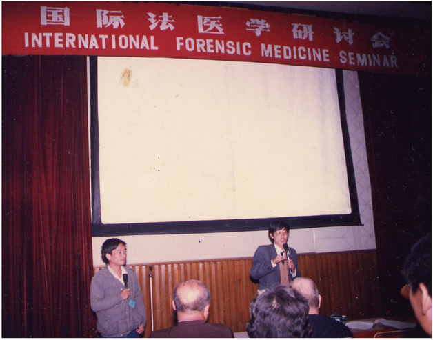 王宏甲(左)在首届国际法医学研讨会在大会作《伟大的法医学家宋慈》专题报告,翻译(右)正用英语翻译