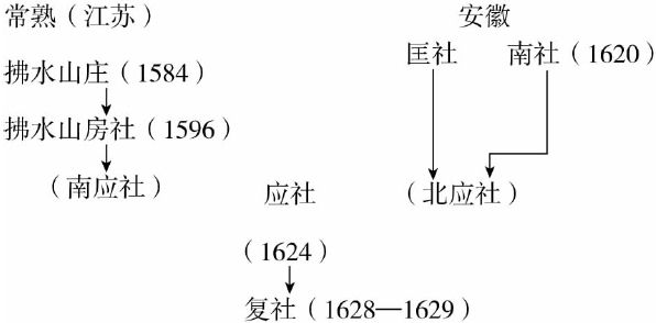 的确,1626年的苏州暴动,意味着应社正从一个文人社团向一种逐渐波及全国的政治运动转变。他们从福建、江西等省吸收了许多成员;1628年,张溥有幸作为恩贡生到北京参加崇祯帝的登基大典,遂在北京建立了应社的支部。第二年,张溥和孙淳又进一步扩大应社的活动。他们发出大量请柬,邀请各地名士至苏州聚会。应邀前来的共有674人,他们同堂宣誓,建立联盟,并将其名称定为复社(见下图)。