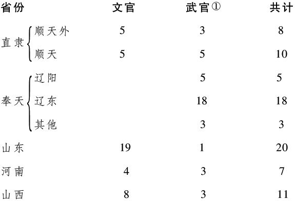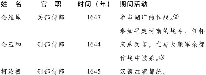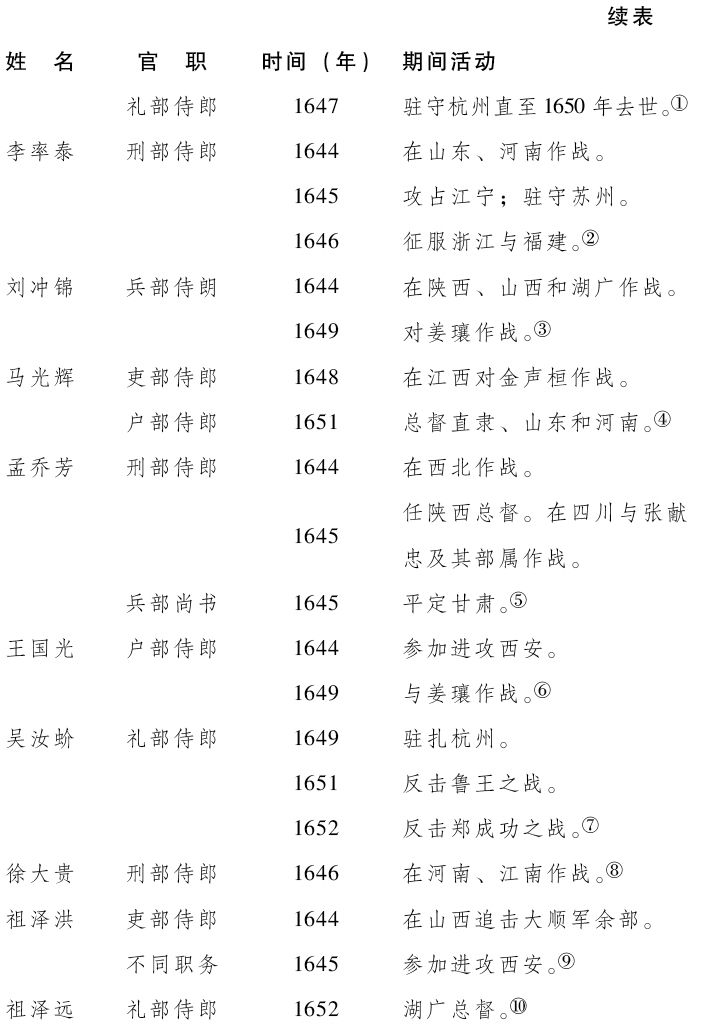 侍郎之职(通常是刑部)照例是由在外作战的将领担任。尚书之职,常常给予主要满洲首领,而1644年与多尔衮入关的汉“旧人”中被任为此官的却屈指可数(孟乔芳,1645年为兵部尚书,是一个例外。正如康熙所言,这是北方平定初年清廷最重要的担任了指挥官的汉人)。另一方面,后来投降的汉人,如下表所示,积官至尚书之职的人数颇为可观。