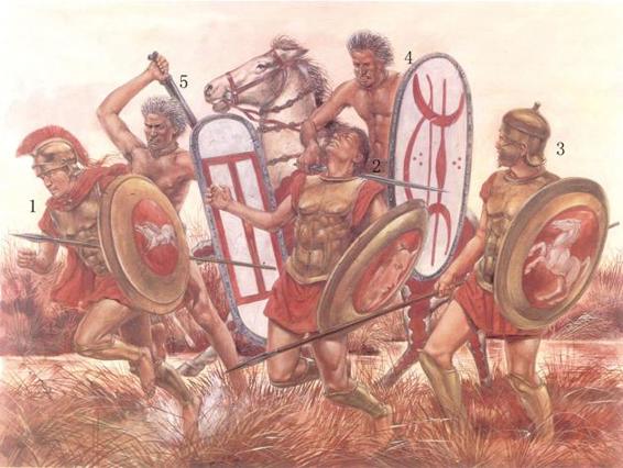 ◎ 高卢入侵中罗马军队战败。凯尔特人擅用长剑,以凶猛的步兵冲锋著称,而罗马人可谓是其青出于蓝而胜于蓝的学生。图中123为罗马重装步兵,4为凯尔特骑兵,5为凯尔特剑士。