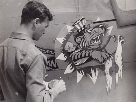 美国空军在华空军作战司令部的艺术家在一架美国飞机机身上画完徽标的最后一笔。这支空军队伍由陈纳德将军领导。现在陈纳德将军负责指挥在华美国空军,他曾经是美国空军援华志愿队即“飞虎队”的指挥官,这支队伍在美国正式对日宣战之前便来到中国。这个新的徽标里,戴着山姆大叔帽子的老虎象征“飞虎队”,如今正式代表美国空军;老虎正撕碎日本旗;青天白日表示它的使命在中国。