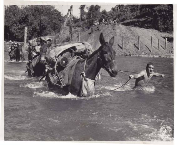Mule skinners attached Mars Task Force.Stripped down to their bare skin to lead mules through the swift river that impeded their progress to Bhamo.