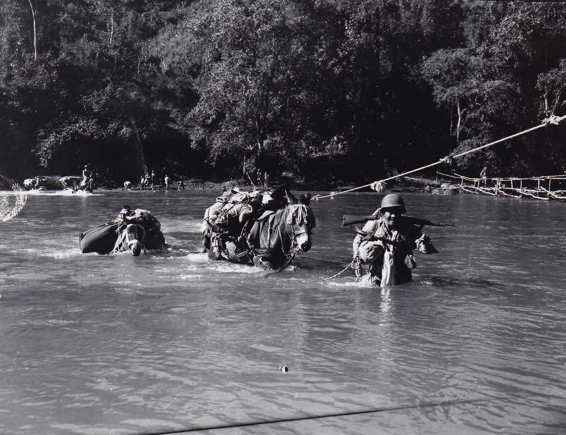 新三十八师112团正在通过竹桥过河。在他们上次与日军于缅甸交手之后的十四个月之后,他们回到中国,他们将在自己的国土上与日军战斗。