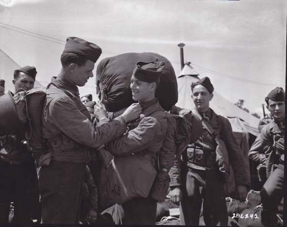 在位于加利福尼亚州,旧金山的冯斯顿公园的集结地的部队,即将出发前往加利福尼亚州梅森港的旧金山登船港口码头登船。当他们为出发作准备时,一个美国士兵为他的好友整理领带。