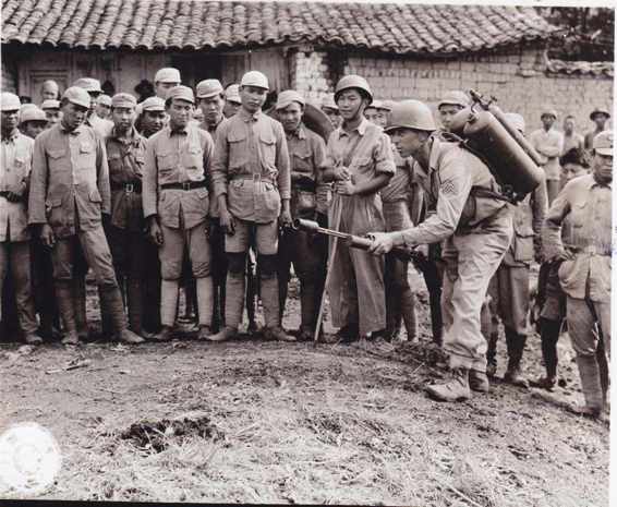 Most important points in the operation of CWS's flame thrower MIAI.Cpl.George L.Oliver,CWS,is instructing Chinese Engineer-Soldiers.