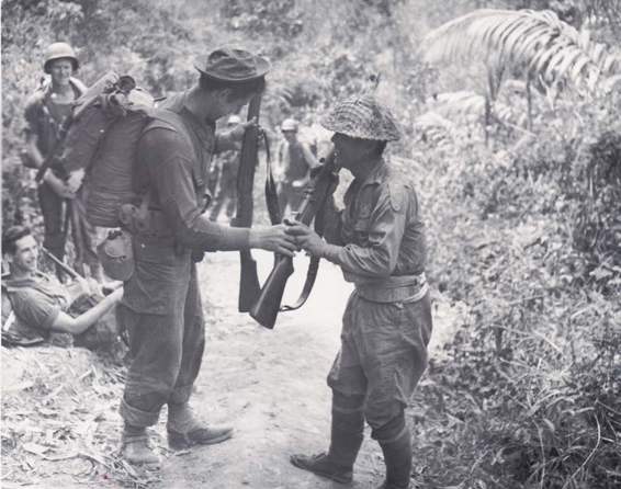 在缅甸帕姆嘎(音译)附近,来自第5307临时整合支队(注:麦瑞尔突击队)的伯纳德·马丁下士和一名中国士兵,互相检查对方的步枪。