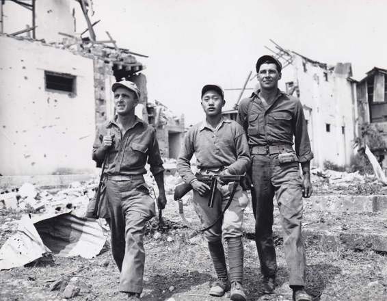 Cpl.Gerald M.Greegan,Washington,D.C.and Cpl.Howard C.Gregory,Wise,Va.,with their Chinese friend,walk away from the ruined area in Lashio,Burma.They are with the Fifth Field Artillery.