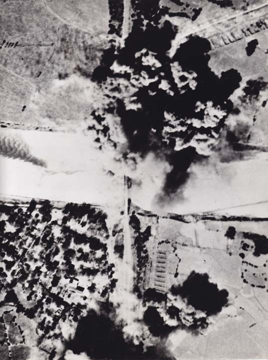 炸弹从美国第10航空队的飞机上落下,击中位于日占缅甸中心地区的木河(音译)上的铁路桥梁。这条铁路交通不断受到盟军空中力量的打击。