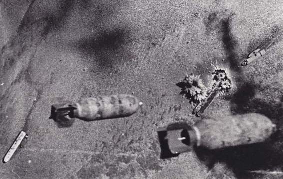 Bombs from aB-25Mitchell bomber of the Tenth U.S.Army Air Force plunge toward Japanese shipping on the Irrawaddy River near Mandalay,Burma launches.The picture shows bomb bursts as adirect hit is scored on one of the towing craft.Planes of the Tenth Air Force have carried on asustained campaign against Japanese transport in Burma,wrecking railroads and taking aheavy toll of Japanese river shipping.