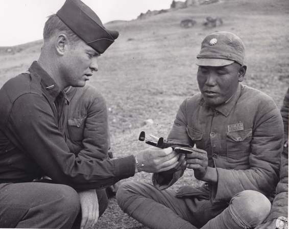 Lt.Norman Cowgill air-ground instructor shows Chinese soldier B-25(mending)during air-ground instruction class.