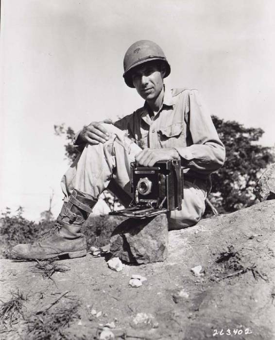 Sgt. Robert Neubacher with his camera, is a member of the 164th Signal Photo Co., at Kamaing, Burma.