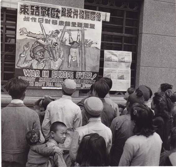 中国士兵和平民注视着战争信息海报上德国彻底向盟军投降的消息。