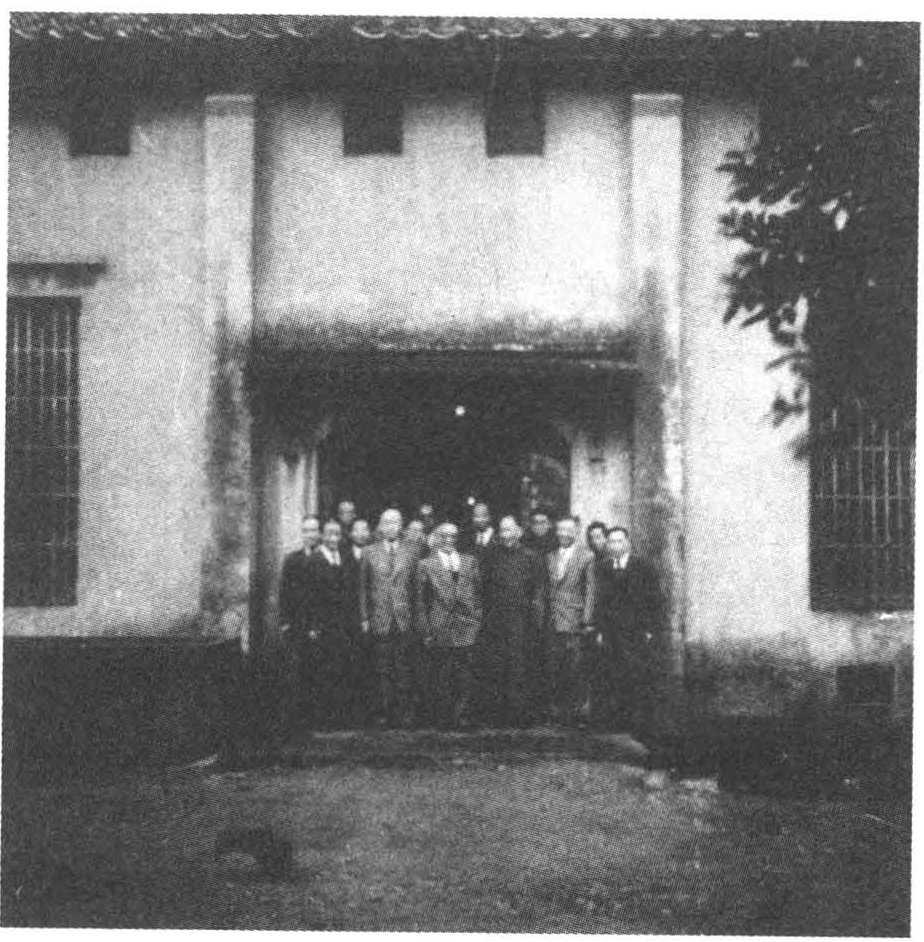 20世纪50年代初,史语所同人在台北杨梅仓库前。(右起)杨时逢、陈槃、芮逸夫、李××、李济、李霖灿、胡适、萧纶徵、朱家骅、×××、李光宇、董作宾、劳榦。