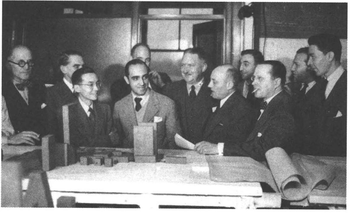 1947年,梁思成(左三)在美国纽约与国际著名建筑师一起讨论联合国大厦设计方案。