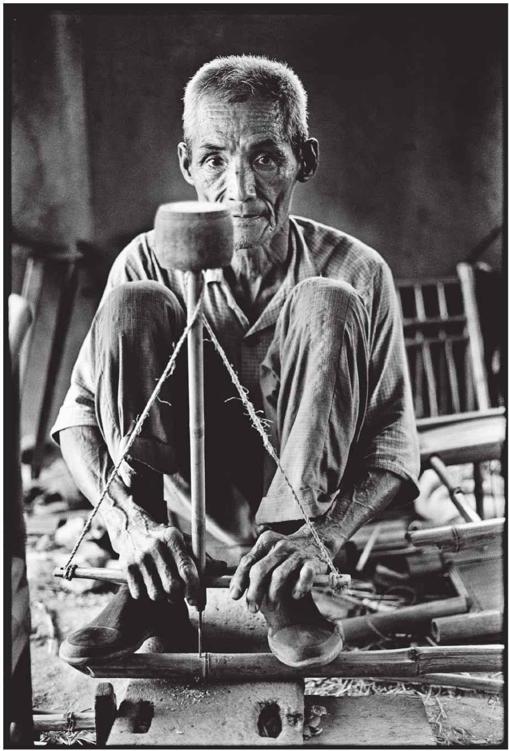 一间矮小的工寮搭在菜园上,走进一看,工作了老半天的竹器匠已很疲累,有点不悦地质问:“你要干什么?”我赶紧报名:“我是木匠顺的第三个后生,阿忠。”之后,他是全力配合我这个摄影新手的笨拙安排,要怎么拍,他就依着摆姿态。《汉声》杂志向来以全记录为原则,我几乎是按工序将一把竹椅的制作过程全给拍完了。为了感谢老人的配合,我特地向他买下那把手艺精湛、造型古趣的矮脚椅。