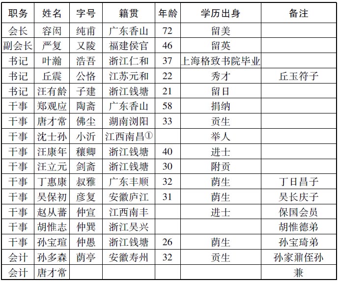 除南京的响应者外,国会会员主要分为四部分,其一,以唐才常为首的康、梁派,包括张通典、狄平、沈荩、唐才质、龙泽厚等;其二,以汪康年、叶瀚为首的江浙派,有汪立元、汪有龄、丘震、孙宝瑄、宋恕、夏曾佑、胡惟志,以及与之关系密切的旅沪人士沈士孙、孙多森、孙多鑫等;其三,因义和团事件由京津等地避乱南来者,如严复、王修植、伍光建、陈锦涛、方城、蒋新皆、温宗尧、赵从蕃等;其四,其他新学名士,如容闳、郑观应、文廷式、陈三立、丁惠康、吴保初等。后两类虽各有政见,却较少派系意识,周旋于康、梁派与江浙派之间。可以说,弄清康、梁派与江浙派的关系,是把握国会内部派系组合的关键,也是探讨分析国会宗旨主张与实际活动的前提。